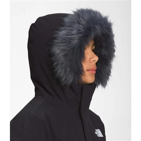- Attached hood with an encased-elastic rain tunnel and removable faux-fur trim